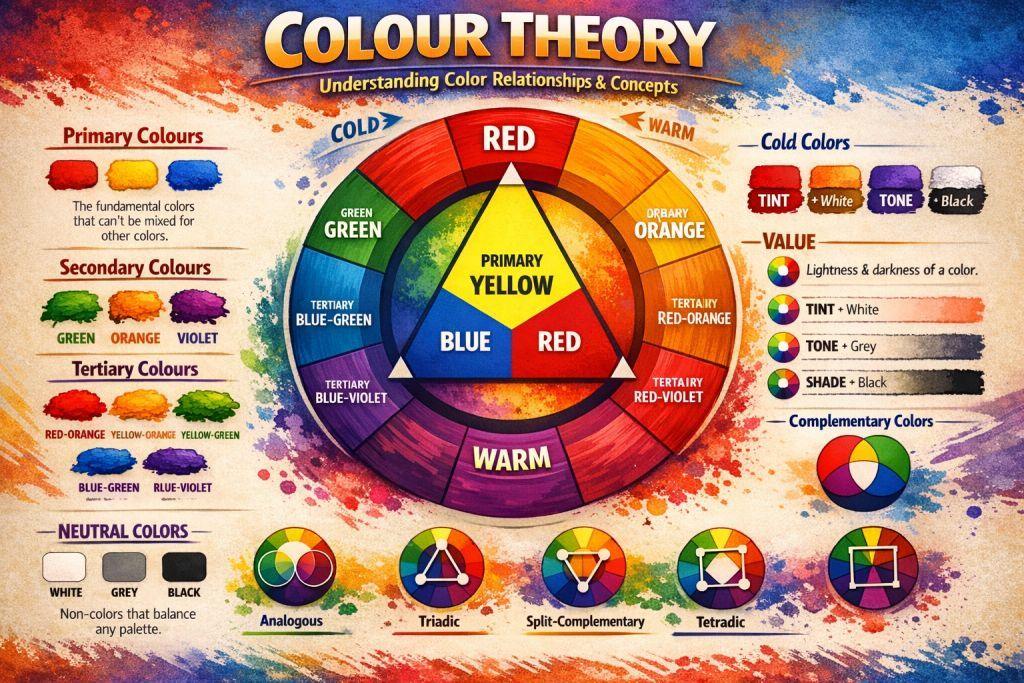 Colour Wheel रंगों के तार्किक संबंधों और उनके मिश्रण को दर्शाने वाला एक दृश्य आरेख (Visual Chart) है, जिसे 1666 में सर आइजैक न्यूटन द्वारा विकसित किया गया था। यह प्राथमिक (लाल, पीला, नीला), द्वितीयक और तृतीयक रंगों को एक चक्र में व्यवस्थित करता है, जिसका उपयोग कलाकारों और डिजाइनरों द्वारा आकर्षक रंग योजनाएं (Colour Schemes) बनाने और रंगों को समझने के लिए किया जाता है। यह सिर्फ़ आर्टिस्ट्स के लिए नहीं होती, बल्कि हमारी रोज़मर्रा की ज़िंदगी में भी इसका बड़ा काम है। आइए आसान भाषा में इसे समझते हैं।